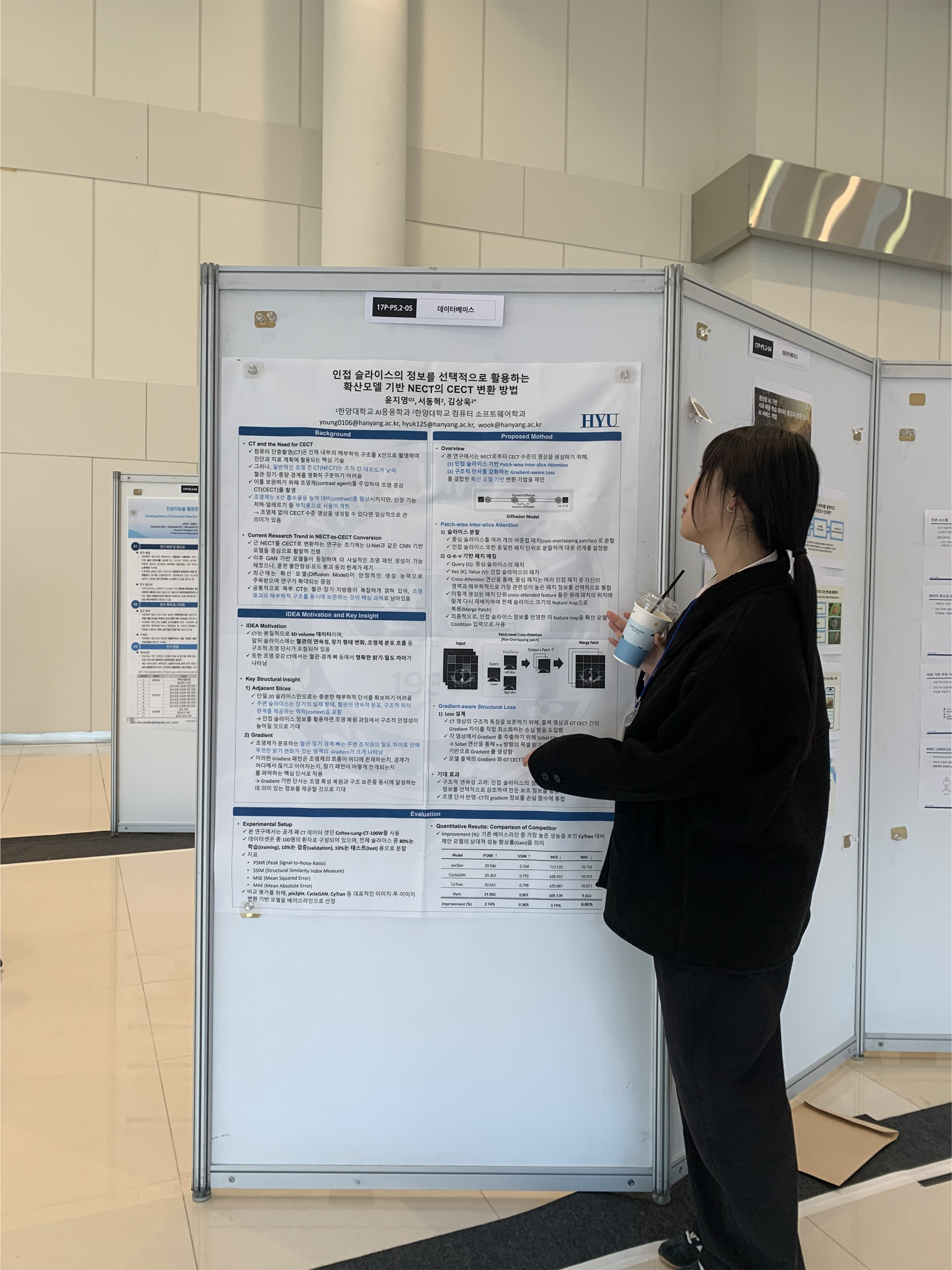 소중한 기회를 제공해 주셔서 2025년 12월 16일(월)부터 19일(금) 4일간 여수에 위치한 엑스포컨벤션센터에서 한국소프트웨어종합학술대회(KSC 2025)에 참석하였습니다. 저는 학회 기간 중 ‘인접 슬라이스의 정보를 선택적으로 활용하는 확산모델 기반 NECT의 CECT 변환 방법’을 주제로 포스터 발표를 진행하였습니다. 제가 발표한 논문은 조영제 투여 없이 촬영한 CT 영상(NECT)으로부터 조영제를 투여한 CT 영상(CECT)을 합성하는 딥러닝 모델에 관한 내용입니다. 특히 인접 슬라이스 간의 해부학적 관계를 반영하는 지역 어텐션 메커니즘과 기울기 기반 손실 함수를 도입하여 기존 모델 대비 성능을 향상시킨 연구입니다. 포스터 세션을 진행하며 의료 영상 처리와 딥러닝에 관심 있는 많은 연구원분이 찾아오셔서 교류하기도 하였고, 여러 분야에 학우도 만날 수 있었던 귀중한 시간을 보냈습니다. 또한, 평소 관심을 가지던 연구 분야의 연구도 살펴볼 수 있는 기회가 되었습니다.