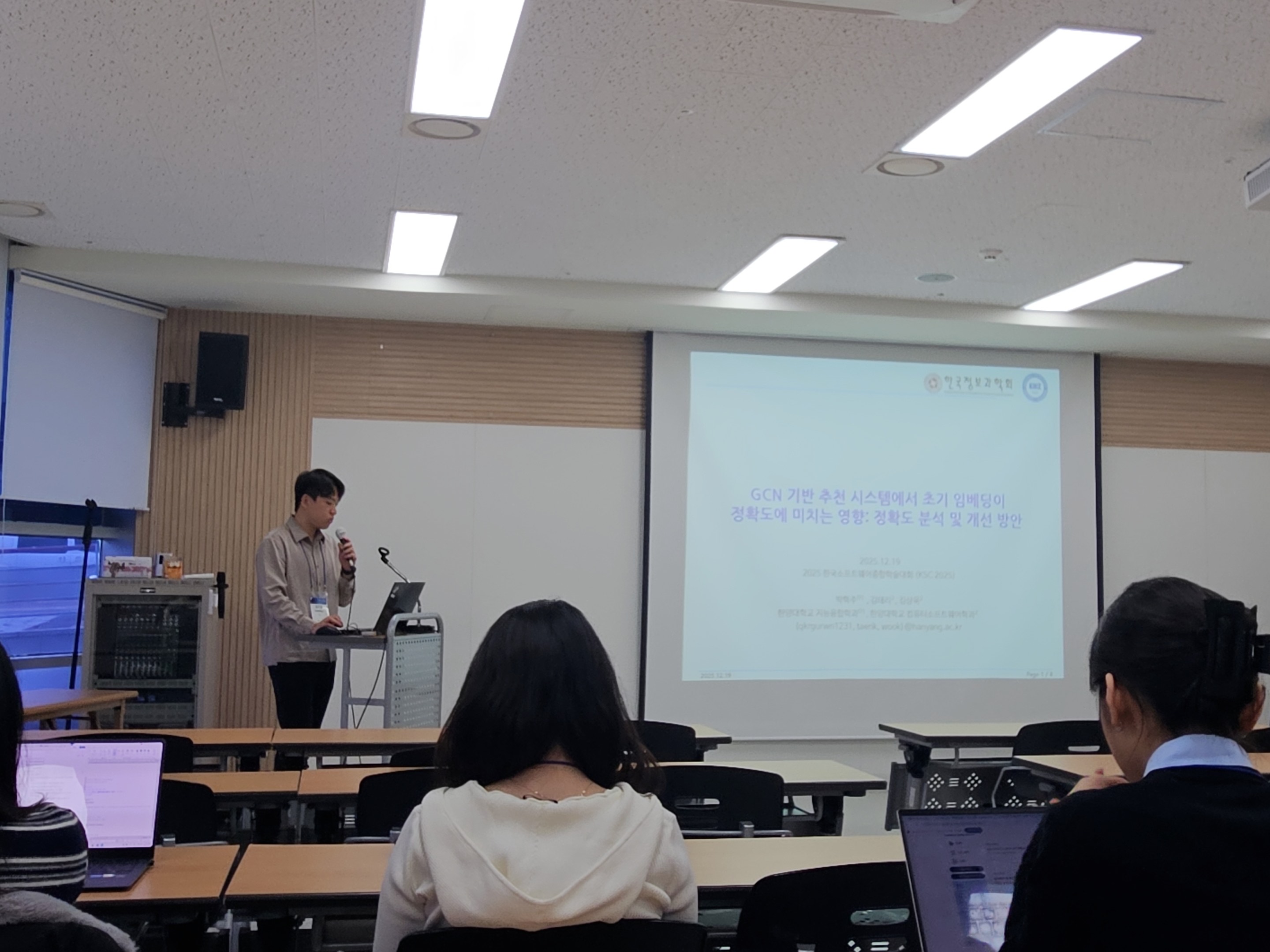 2025년 12월 16일(화)부터 12월 19일(금)까지 여수에서 개최된 2025 한국소프트웨어종합학술대회(KSC 2025)를 참석하였습니다. 학회 첫째 날인 화요일에 데이터소사이어티 Learning on the Data Plane 워크샵에 참석하여 데이터 관련 다양한 주제에 대한 강연을 들었고, 학회의 넷째 날인 금요일에는 “GCN 기반 추천 시스템에서 초기 임베딩이 정확도에 미치는 영향: 정확도 분석 및 개선 방안”을 주제로 발표를 진행하였습니다. 제가 발표한 논문은 GCN 기반 추천 시스템에서 사용자의 선호도 예측을 위해 사용되는 사용자와 상품의 최종 임베딩 획득 과정에 초기 임베딩이 포함되는 것이 추천 정확도에 어떤 영향을 주는지 분석하고, 더 높은 추천 정확도를 위해 초기 임베딩의 영향력을 조절하는 방안을 제안하는 논문입니다. 오럴 발표를 통해 저의 논문을 다른 연구원들께 공유하고, 깊이 있는 질의응답 시간을 통해 다양한 관점에서 저의 논문을 볼 수 있어 뜻깊은 시간이 되었습니다.