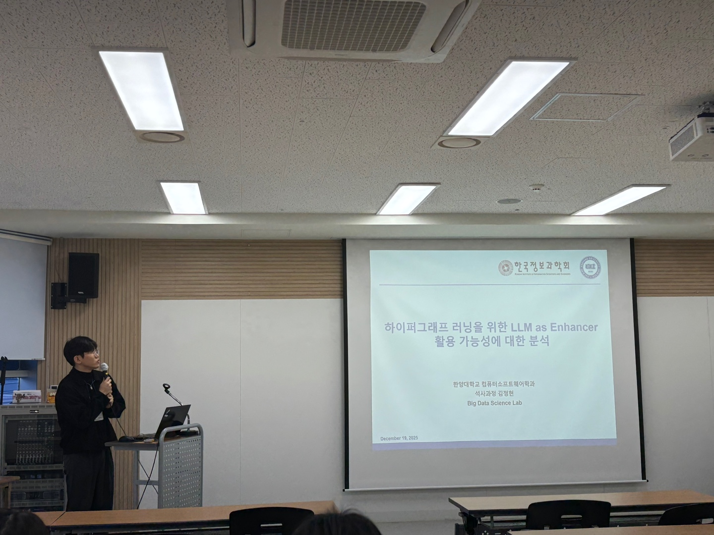 저는 이번 학회에서 “하이퍼그래프 러닝을 위한 LLM as Enhancer 활용 가능성에 대한 분석”이라는 주제로 발표하였습니다. 본 발표에서는 하이퍼그래프 학습에서 기존 GNN 기반 접근이 가지는 표현적 한계를 짚고, 대규모 언어모델(LLM)을 보조적 모듈로 활용하여 노드 및 하이퍼엣지의 의미적 표현을 강화할 수 있는 가능성을 분석적으로 논의하였습니다. 발표를 준비하는 과정에서는 연구 내용을 보다 명확하고 설득력 있게 전달하는 데 집중하였고, 실제 발표를 통해 다양한 피드백을 얻을 수 있었습니다.