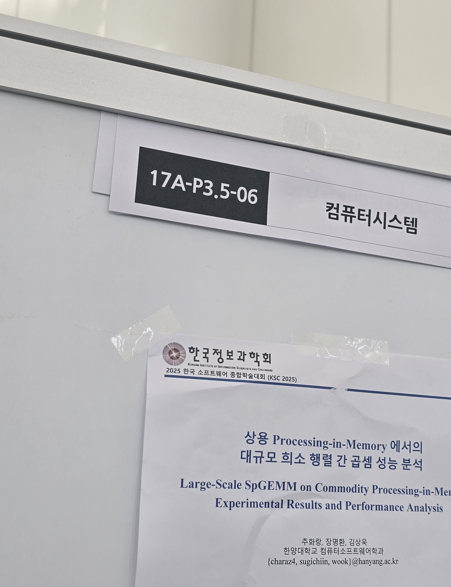 25년 12월 16일(월)에 시작해 25년 12월 19일(목)까지 여수엑스포에서 진행된 한국정보과학회 주관 2025 한국소프트웨어종합학술대회 (KSC2025)에 참석하였습니다. 본인은 “상용 Processing-in-Memory 에서의 대규모 희소 행렬 간 곱셈 성능 분석”이라는, UPMEM 社의 DRAM 기반 PIM 장치를 활용한 SpGEMM 성능을 분석하는 주제의 논문을 포스터 포맷으로 발표하였으며, 찾아주신 참가자 분들과 PIM 연구, 활용 방향성, 동향에 대해 유익한 대화를 나누었습니다.