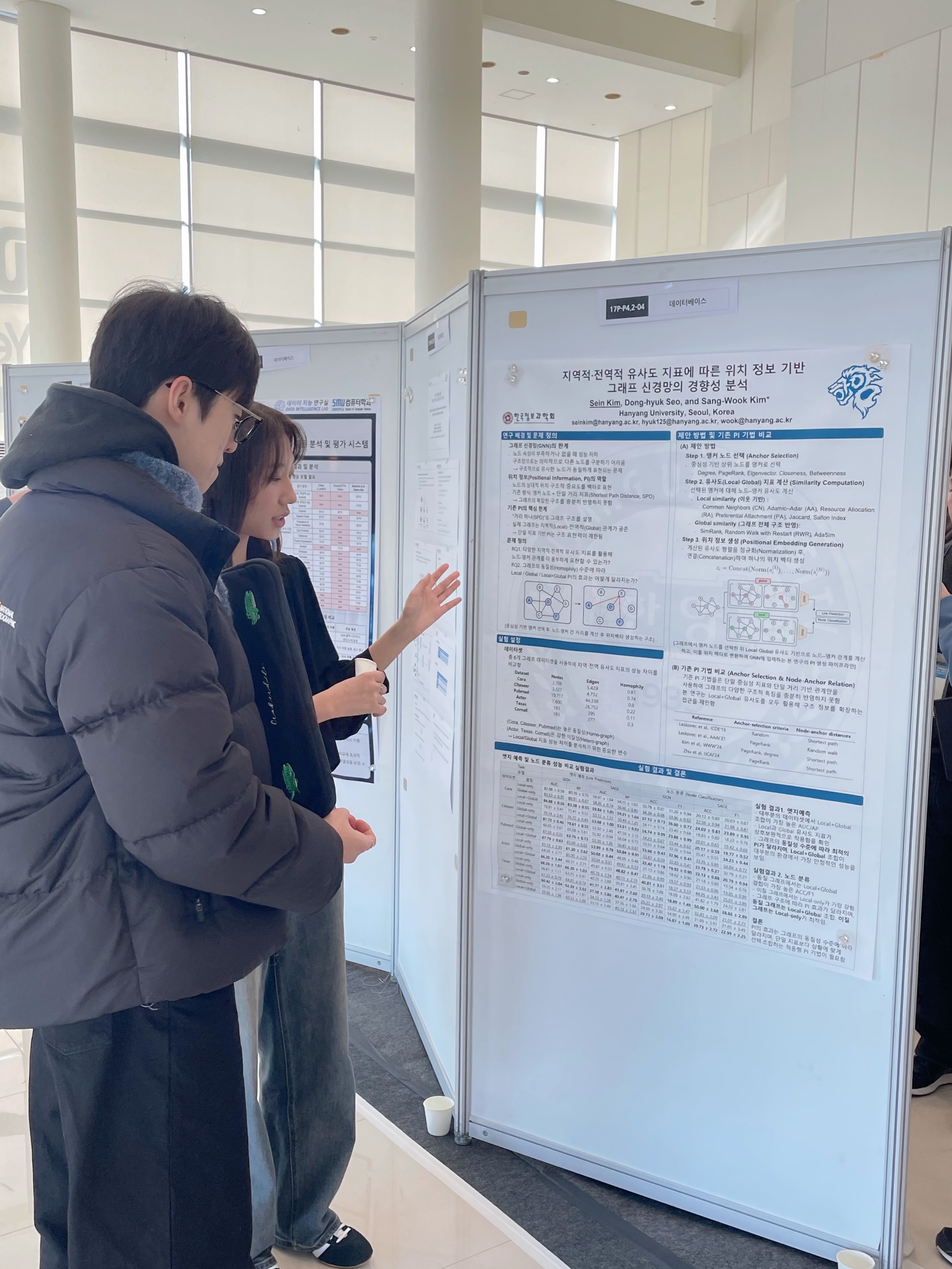 2025년 12월 16일(화)부터 12월 19일(금)까지 개최된 한국정보과학회 KSC 2025에 참석하였습니다. 본 학회에서 데이터베이스 세션의 포스터 발표를 통해 「지역적·전역적 유사도 지표에 따른 위치 정보 기반 그래프 신경망의 경향성 분석」이라는 주제로 연구 결과를 발표하였습니다.